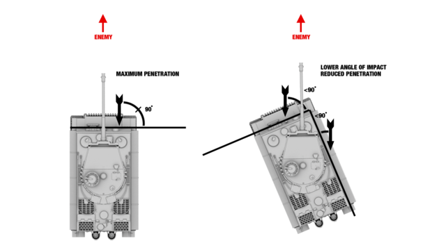 Esto es cuestion de física, si ustedes dejan el tanque a un ángulo de 90° (recto) el proyectil los va a penetrar con mas fuerza. En cambio, si lo inclinamos, el disparo tiene la probabilidad de "resbalar" con la inclinacion, creando el efecto de rebote.
