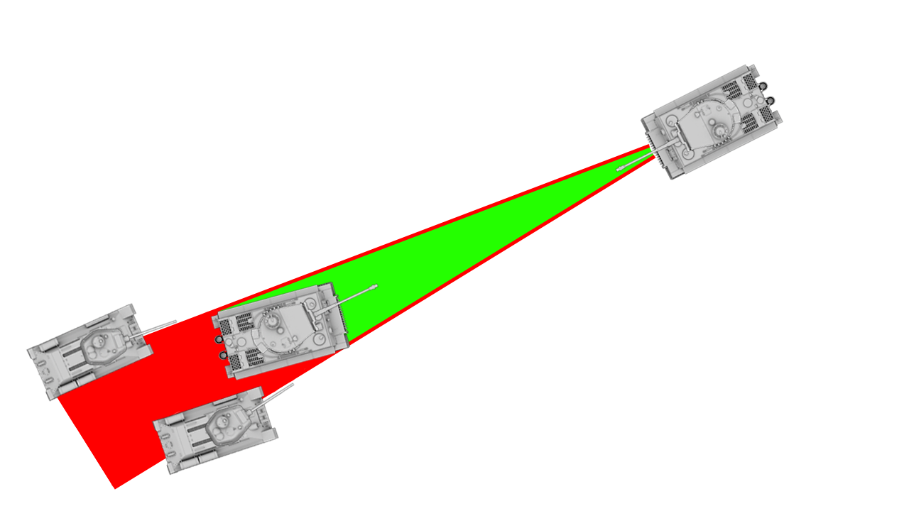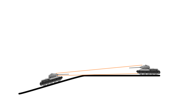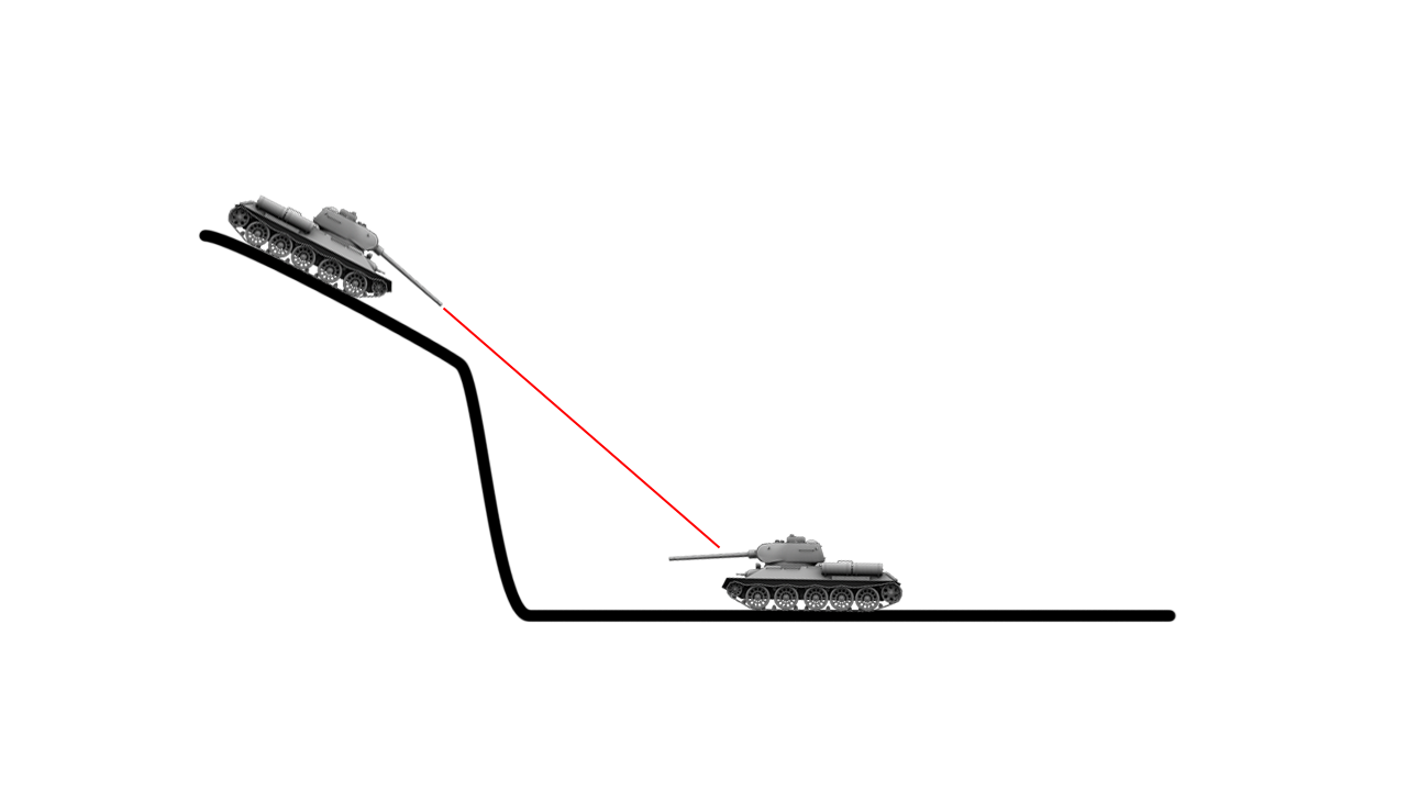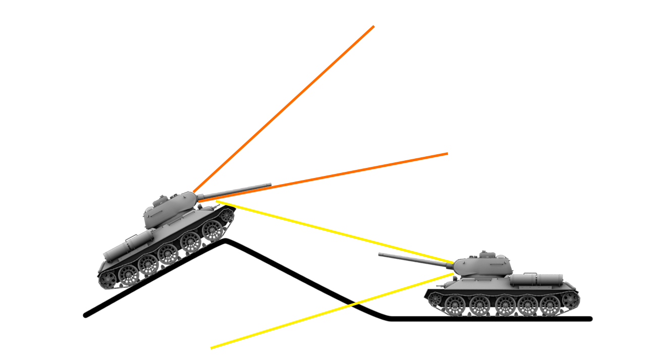 Si estan en terreno elevado, y debajo tienen un enemigo, traten de golpearlo desde arriba. La parte superior de los tanques no posee mucho blindaje, al igual que la parte inferior, por lo que les facilitará mucho la penetracion... Pero tengan cuidado con el blindaje. ¿Por qué? Veran, en la imagen muestra una forma perfecta de penetracion, debido a que el enemigo tiene un blindaje inclinado, entonces la trayectoria del disparo va a penetrar en un ángulo de 90°, por lo que facilita la penetracion.